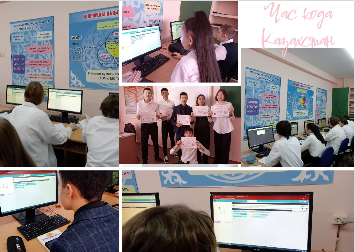Инновациялық технологиялар туралы білімді ерекше тәсіл арқылы таратуға бағытталған "Код сағаты" акциясының бірінші күні мектебіміздің 8,9,10 сынып оқушылары деңгейлерден өтіп, ойын соңында Сертификаттарын алды. Жауаптылар: информатика пән мұғалімдері.
