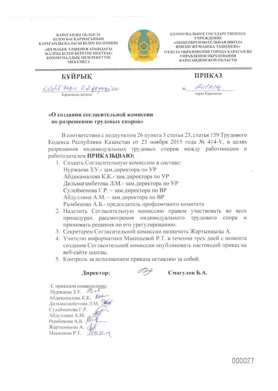 Приказ о создании согласительной комиссии по разрешению трудовых споров