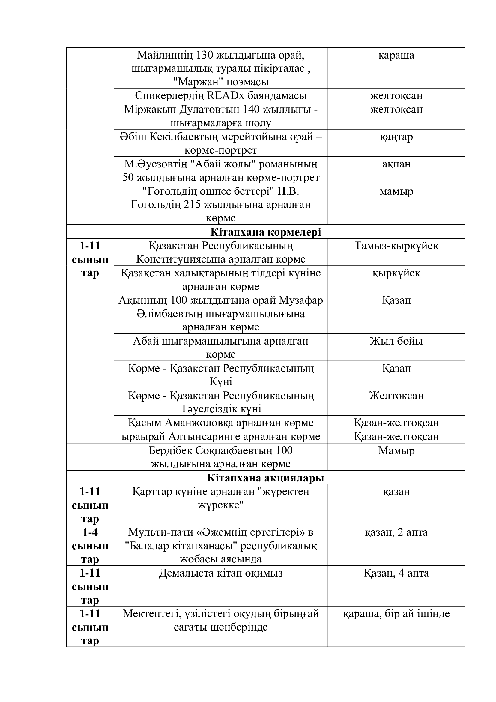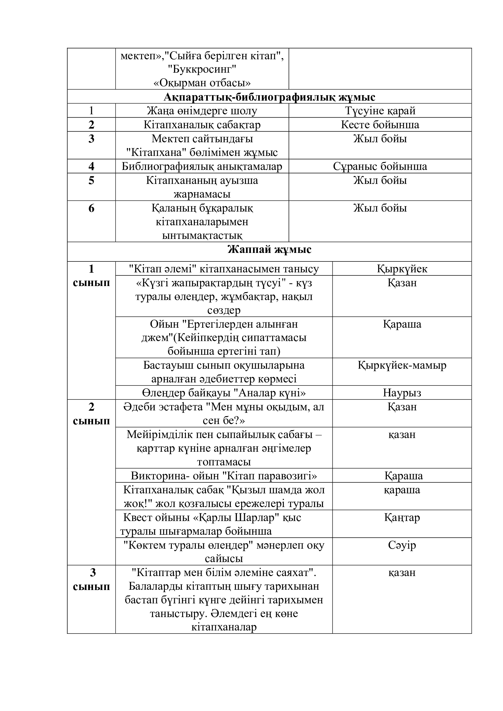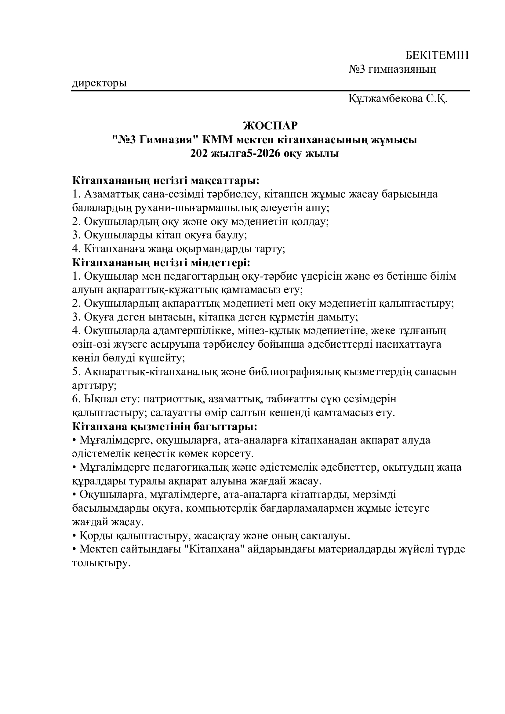 "№3 Гимназия" КММ мектеп кітапханасының жұмыс жоспары