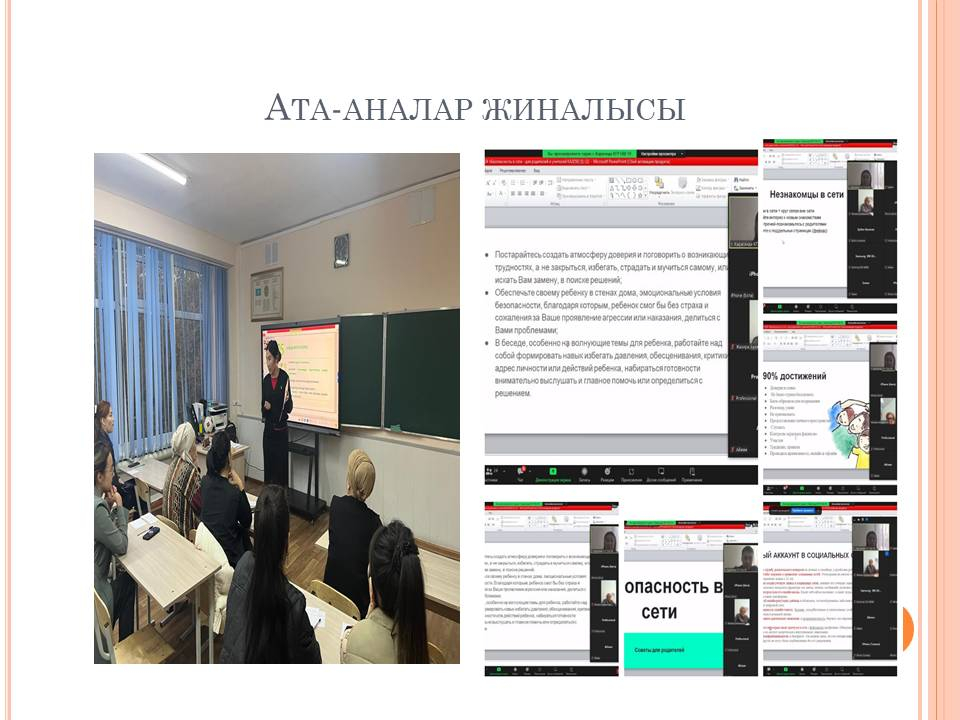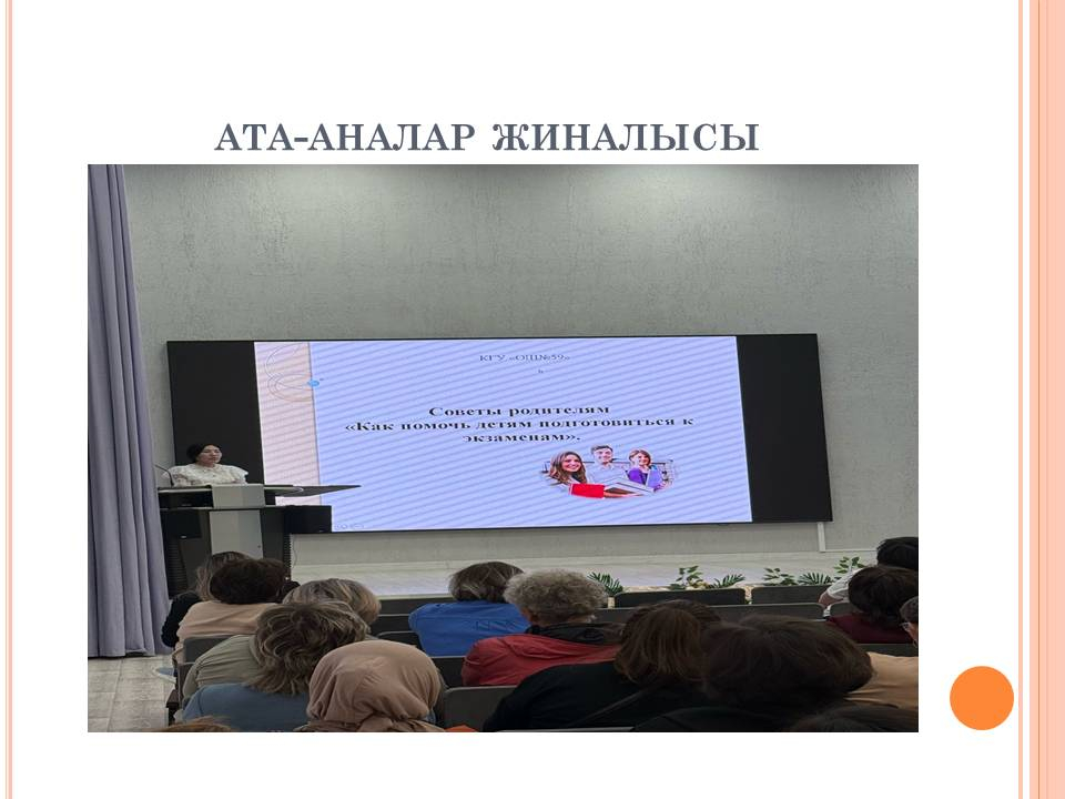 На собрании присутствовали: директор школы Балмуханова Д.К., Зам. директор по ВР Копбаева Л.Х., Зам. директор по УВР Жанатаева Г.А., классные руководители: 11 «А» класса - Амиева А.А., 11 «Ә» класса – Алентаева И.А., учителя – предметники, педагоги – психологи, родители. На собрании обсуждался вопрос по итогам пробного тестирования, дальнейшая совместная работа школы, родителей и будущих выпускников. Педагогами - психологами школы проводился тренинг в игровом формате. Для изложения информации использовался слайдовый материал, видео - ролики, родители получили памятки по подготовки к ЕНТ.