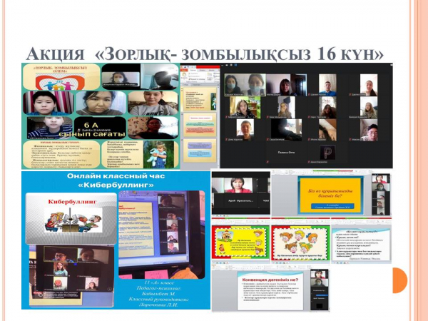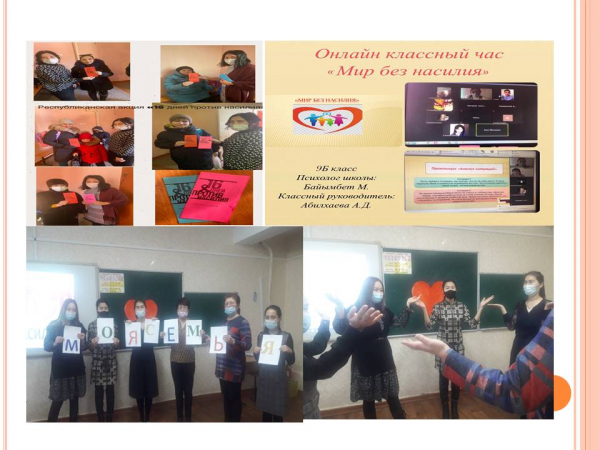 Балаларға қатысты зорлық-зомбылықтың алдын алу бойынша ақпараттық оңкүндік аясында мектеп психологы «Зорлық-зомбылықсыз әлем» атты тақырыпта 7 «Б» сынып оқушыларымен тренинг сабақ өткізілді.