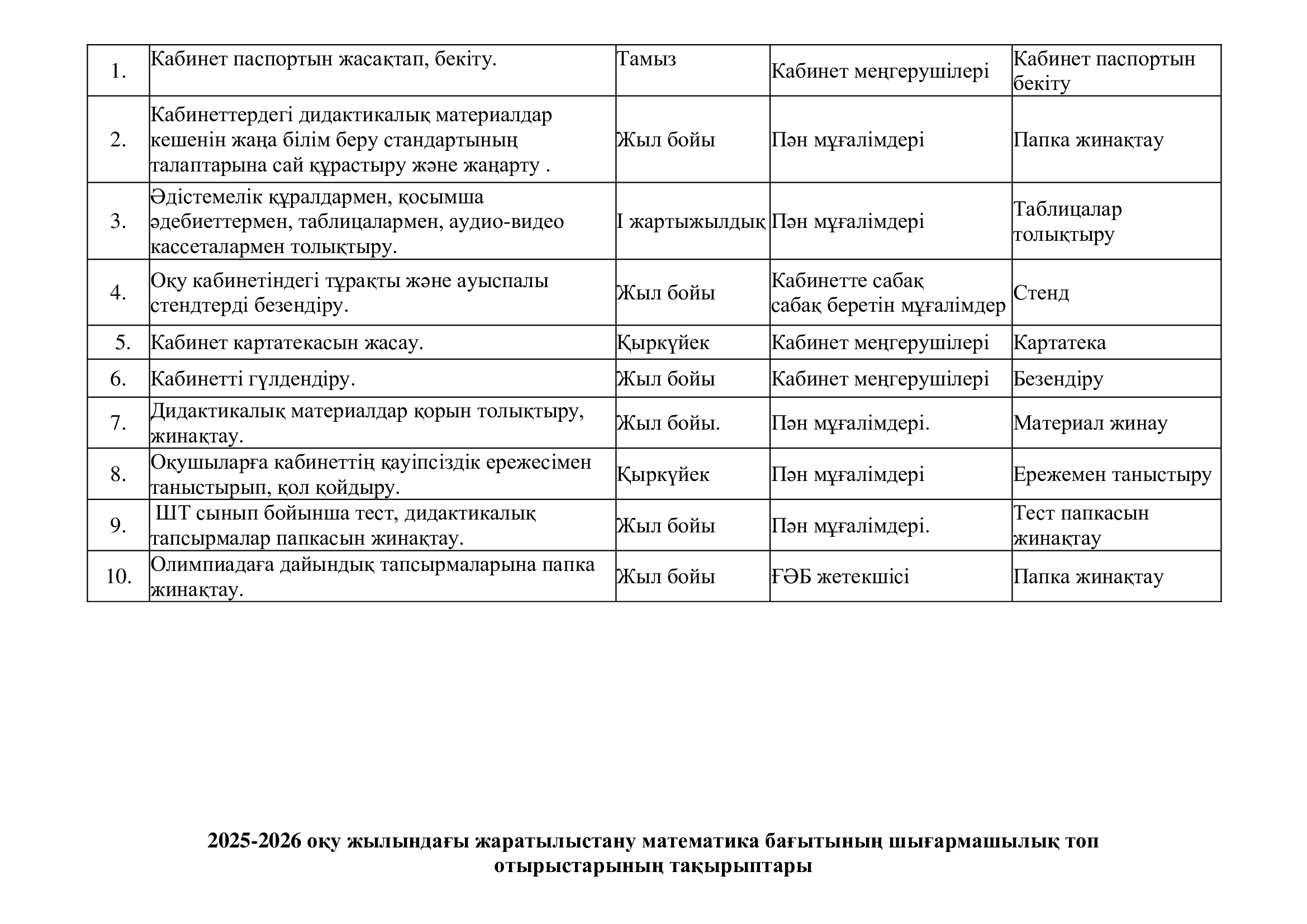 Шығармашылық топжұмысына жауапты бірлестік жетекшісі,оқу бағдарламасының орындалуын қадағалау,білім тексеру қорытындысын жинақтау. Кабинетті тексеру. Пәндік апталықты ұйымдастыру, өткізу. |