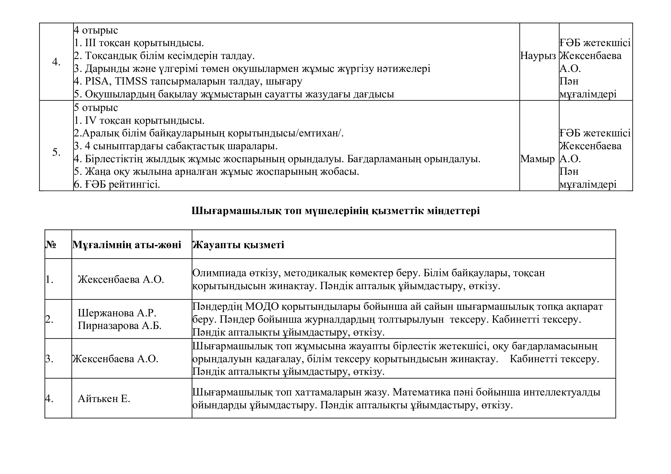 4 отырыс 1. ІІІ тоқсан қорытындысы. 2. Тоқсандық білім кесімдерін талдау. 3. Дарынды және үлгерімі төмен оқушылармен жұмыс жүргізу нәтижелері 4. PISА, TIMSS тапсырмаларын талдау, шығару 5. Оқушылардың бақылау жұмыстарын сауатты жазудағы дағдысы |
