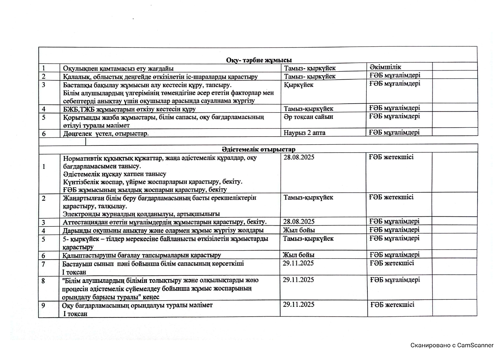 Күнтізбелік, тәрбие жұмысы  жоспарын құру ,әдістемелік отырыста қарау. Пәндер бойынша «Қалыптастырушы бағалау» тест құрастыру. Пәндер бойынша оқушылардың білім сапасындағы олқылықтарды жою үшін,білім үзігін сынама жұмысын алу,қорытындысынанықтау.