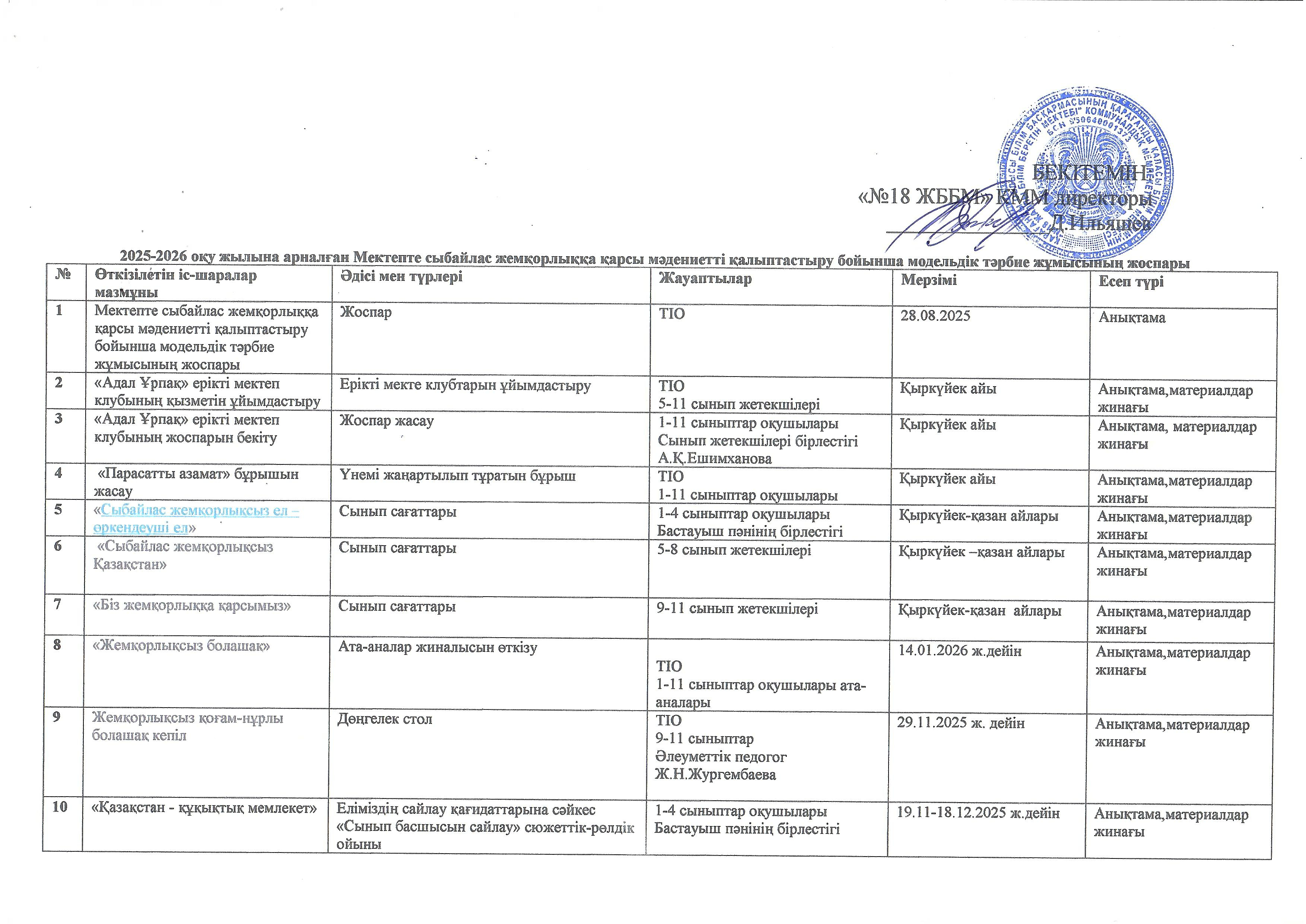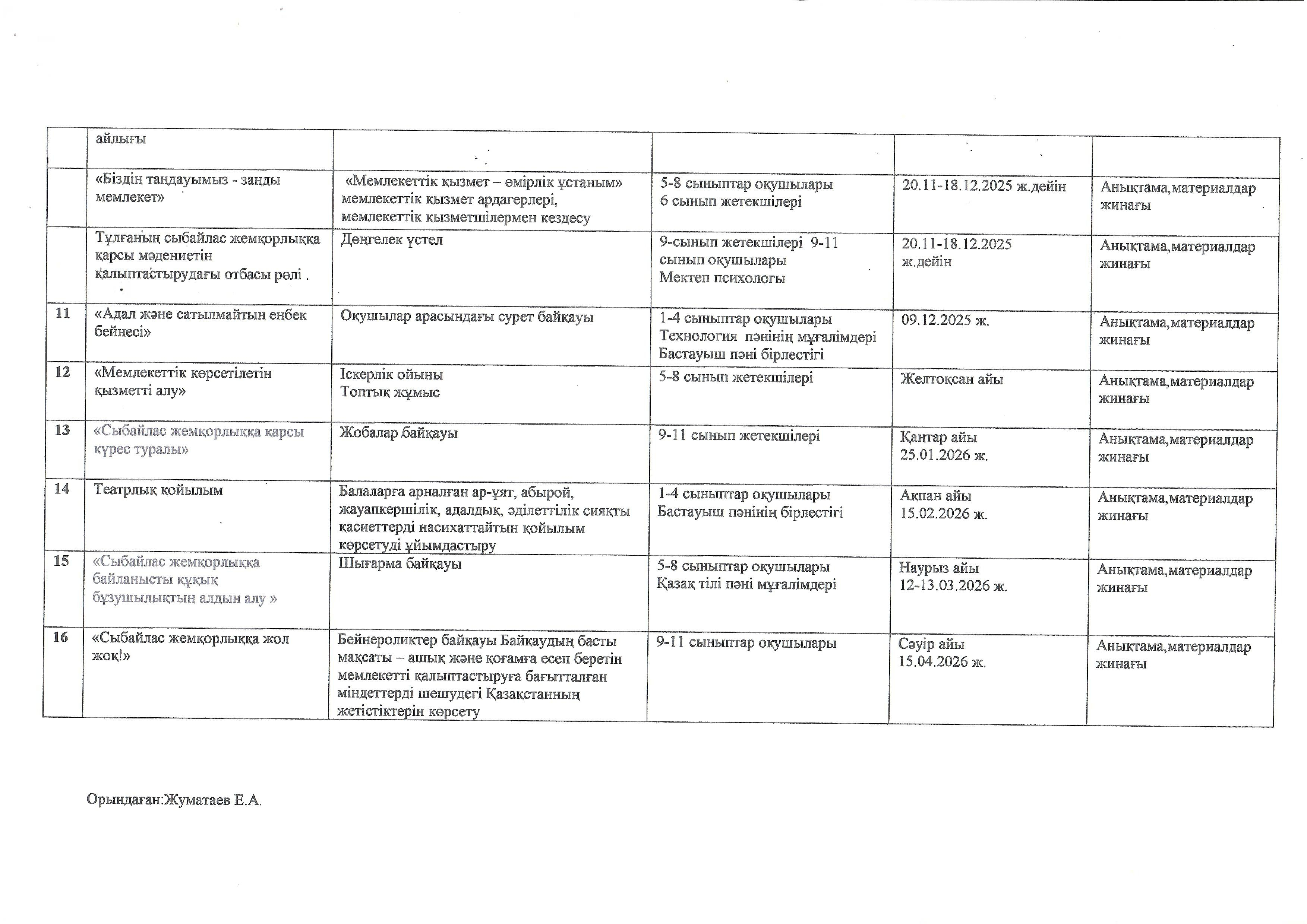 Сыбайлас жемқорлыққа қарсы мәдениетті қалыптастыру бойынща тәрбие жұмысының моделдік жоспарына сәйкес жүргізілетін жұмысына