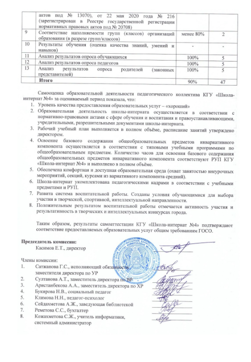 Проанализировав работу КГУ «Школа-интернат №4» за период с 2023-2024 учебного года по I четверть 205-2026 учебного года по всем критериям Приказа и.о. Министра просвещения Республики Казахстан от 27 июня 2023 года № 183 «О внесении изменений в Приказ Министра просвещения Республики Казахстан от 5 декабря 2022 года № 486 "Об утверждении критериев оценки организаций образования»» в рамках государственной аттестации организаций образования комиссия оценила работу школы по уровню качества предоставления образовательных услуг как «хороший» и рекомендовала аттестовать КГУ «Школа-интернат №4», так как квалификационные требования, предъявляемые к деятельности организации образования, дающего начальное, основное среднее и общее среднее образование с учетом инклюзивного компонента и кружковой работы выполняются полностью.