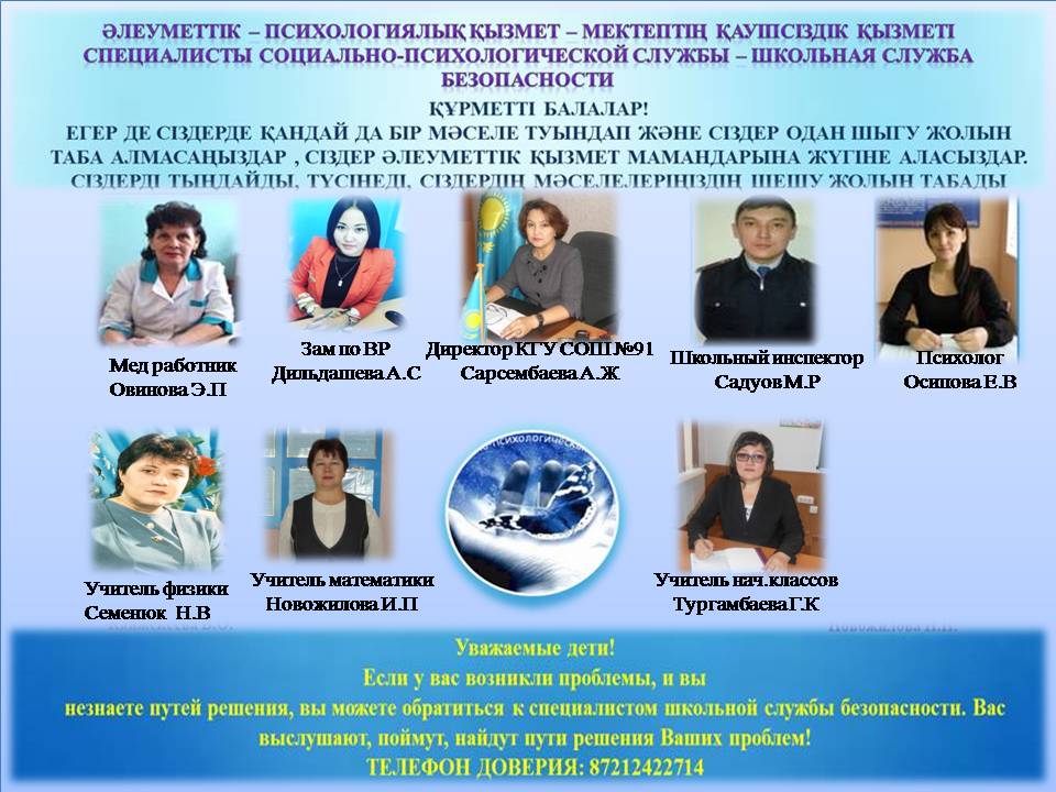 Дир.ТІ жөн. орынб. Мектептің әлеум.педагогы Дир.ТІ жөн. орынб. Дир.ТІ жөн. орынб. Мектеп инспекторы Сынып жетекшілері Әкімшілік Сынып жетекшілері Сынып жетекшілері Әлеум. педагог ЖККТ мүшелері Директордың ТІ жөн. орынбасары Психологтар |