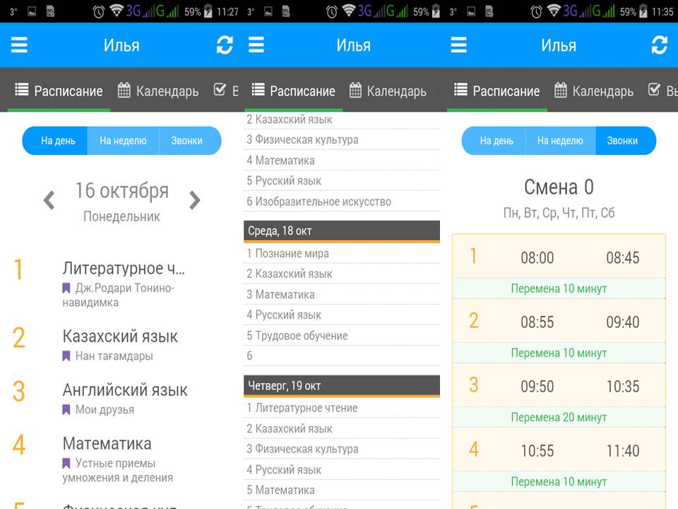Расписание: Следите за расписанием уроков своего ребенка на день или целую неделю, за темами уроков и расписанием звонков.