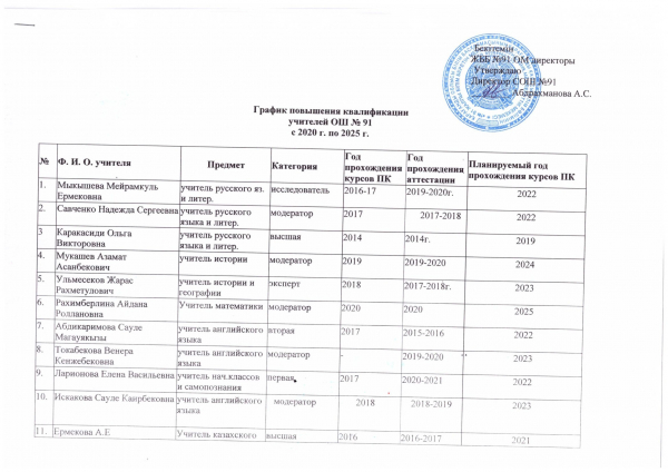 №91ЖББОМ 2020-2021 оқу жылына арналған жұмыс кестесі