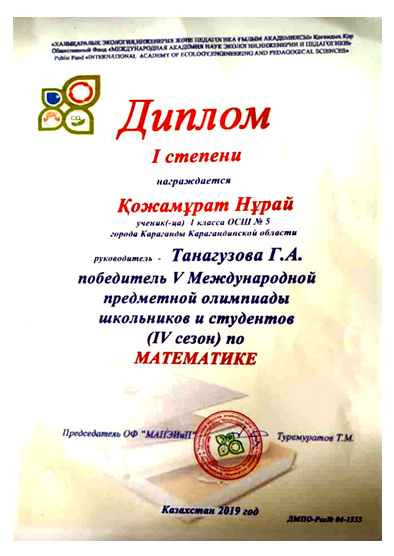 «Халықаралық экология, инженерия және педагогика ғылым академиясы» Қоғамдық Қорының ұйымдастыруымен математика пәні бойынша оқушылар мен студенттердің V Халықаралық пәндер олимпиадасы (ІV кезеңі) өткізілді, оған мектебіміздің 1 «А» сынып оқушысы Қожамұрат Нұрай қатысып, І дәрежелі дипломмен марапатталды. Құттықтаймыз!