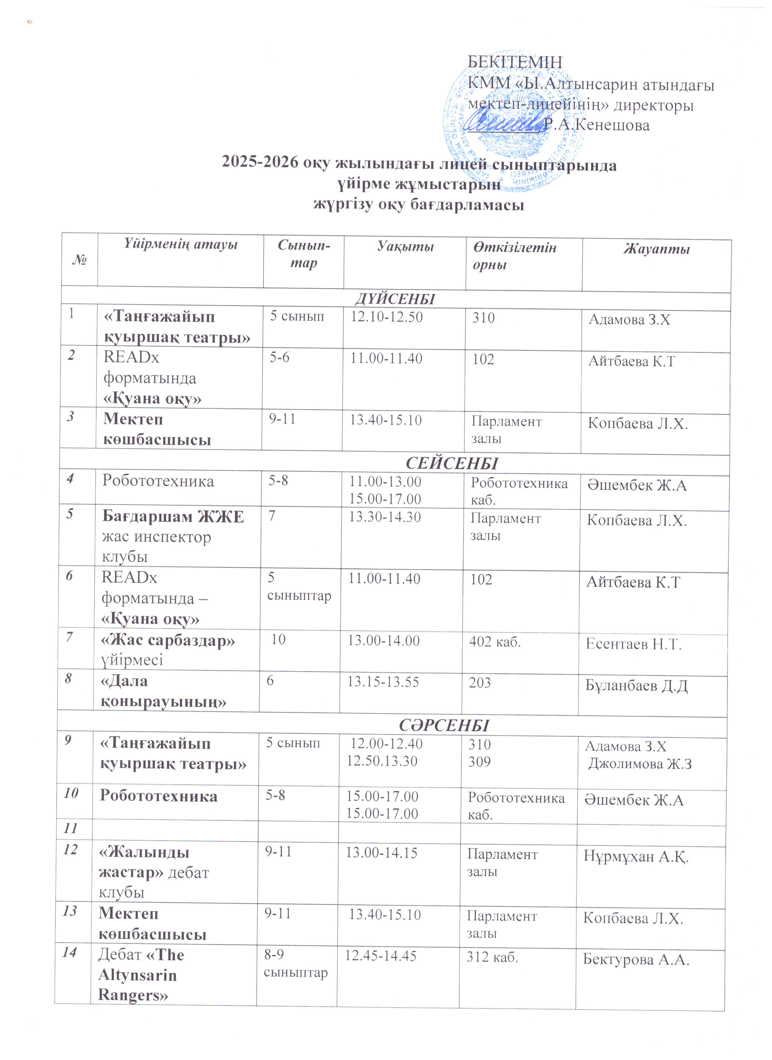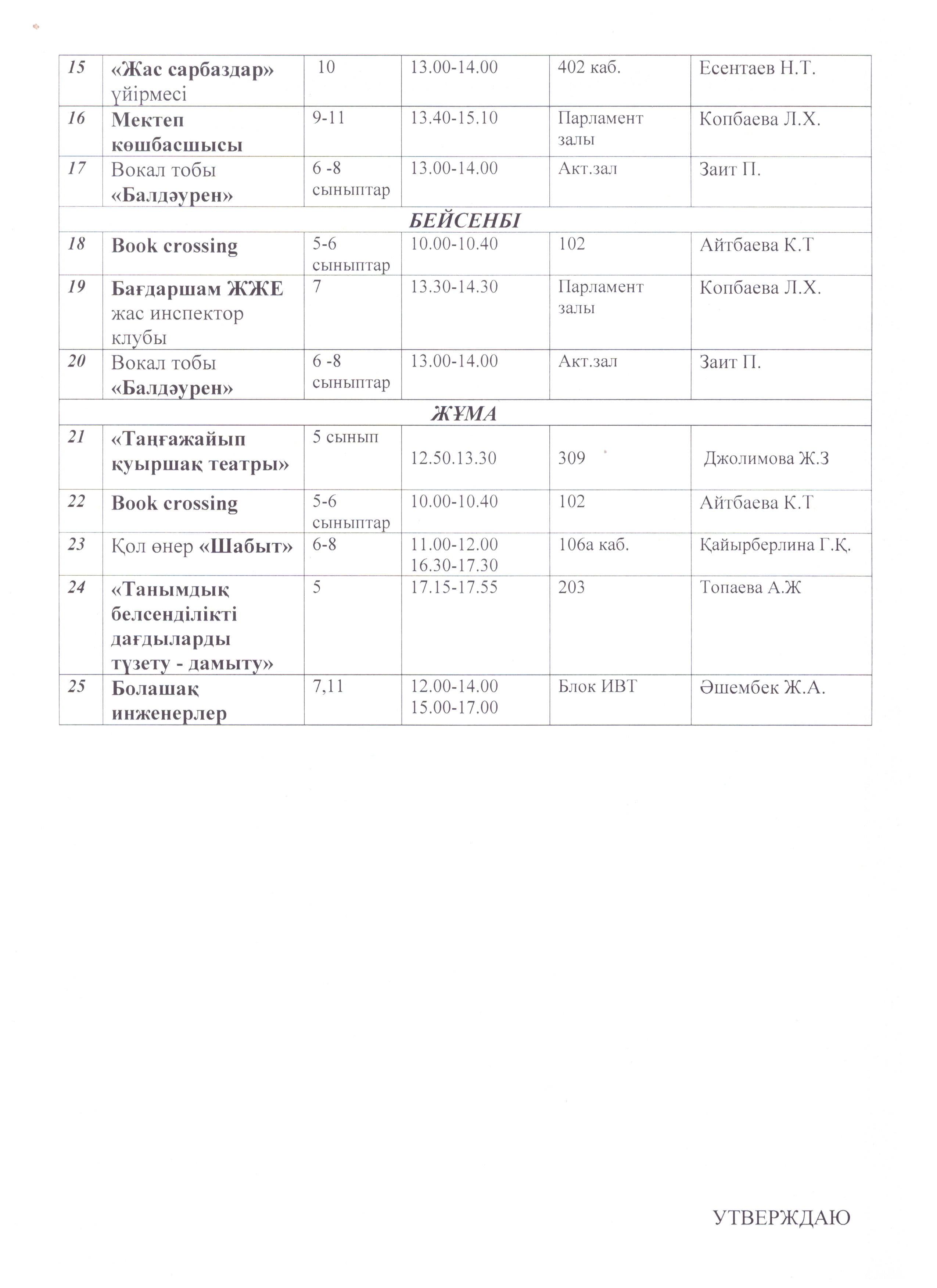 Үйірмелер, секциялар кестесі лицей сыныптары 2023-2024 оқу жылы
