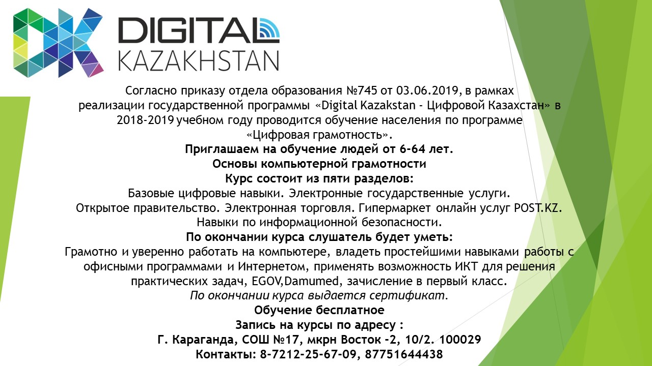 Согласноприказа отдела образования №975 от 18.05.2018, в рамках реализации государственной программы «Digital Kazakhstan-Цифровой Казахстан», в 2017-2018 учебном году проводится обучение населения по программе «Цифровая грамотность».Приглашаем на обучение людей от 16 до 64 лет.