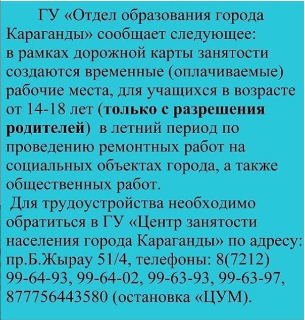 2020-2021 оқу жылына 1 – сыныптарға құжаттарды қабылдау электронды түрде 01.06.2020ж.-30.08.2020ж. аралығында school.kargoo.kz сілтемесі арқылы жүзеге асырылатын болады. Қажетті құжаттар тізімі: • баланың туу туралы куәлік көшірмесі; • денсаулық жағдайы туралы анықтама (медициналық паспорт); • 3 см * 4 см. екі дана фото Ескерту: жоғарыда аталған барлық құжаттар сканерленген болуы қажет!!! Объявление!!! Приём документов в 1 классы на 2020-2021 учебный год будут осуществляться в электронном режиме с 01.06.2020г. по 30.08.2020г. по ссылке school.kargoo.kz Перечень необходимых документов: • копия свидетельства о рождении ребенка; • справка о состоянии здоровья (медицинский паспорт); • две фотографии 3 см *4 см. Примечание: все документы вышеперечисленные отсканировать!!!!!