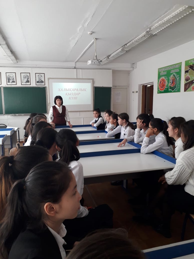 «Қыз елдің көркі» №65 ЖББ ОМ қабырғасында директордың тәрбие ісінің меңгерушісі Л.М.Назарова мен мектеп психологы Т.Д.Кабулованың ұйымдастыруымен 11 қазан бүкіләлемдік қыздар күніне орай «Қыз елдің көркі» деген тақырыпта 9-сынып қыздарымен дөңгелек үстел өтті. Қыздарға түрлі бейнебаяндар көрсетіліп, жақсы жағымды ізгі ниет-тілектер білдірілді. |