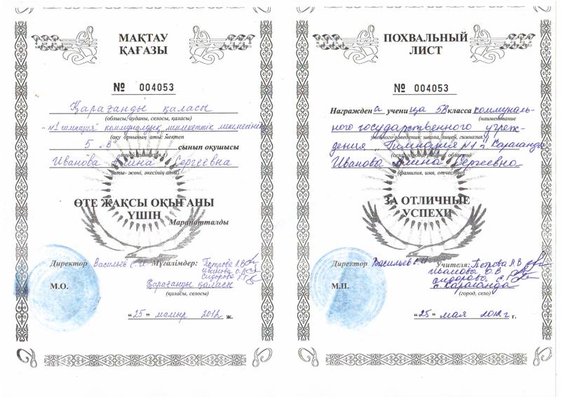 ПОХВАЛЬНЫЙ ЛИСТОбразец заполнения |
