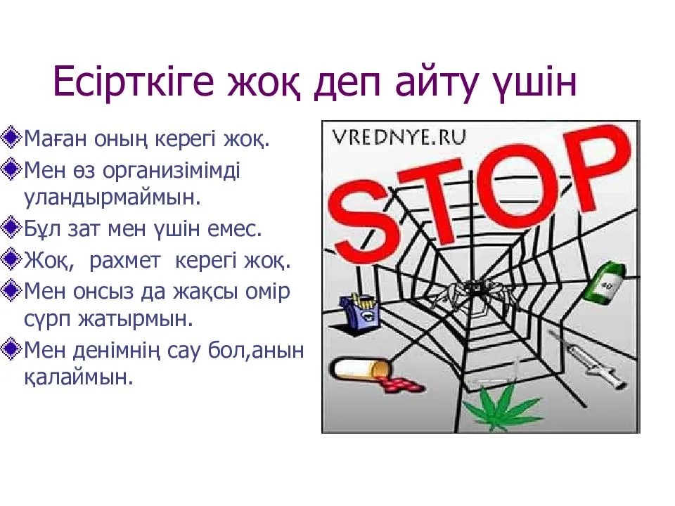 Нашақорлықтың алдын алу бойынша ата-аналарға арналған слайдтарЕсірткіге және олардың таралуына жол жоқ! |