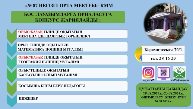 №87 НОМ" КММ 2024 жылдың 19-23 тамыз аралығында бос лауазымдарға орналасуға конкурс жариялайды№87 НОМ" КММ
