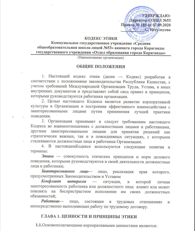 Об утверждении кодекса этики по КГУ "СОШЛ №53"Об утверждении кодекса этики по КГУ "СОШЛ №53" |