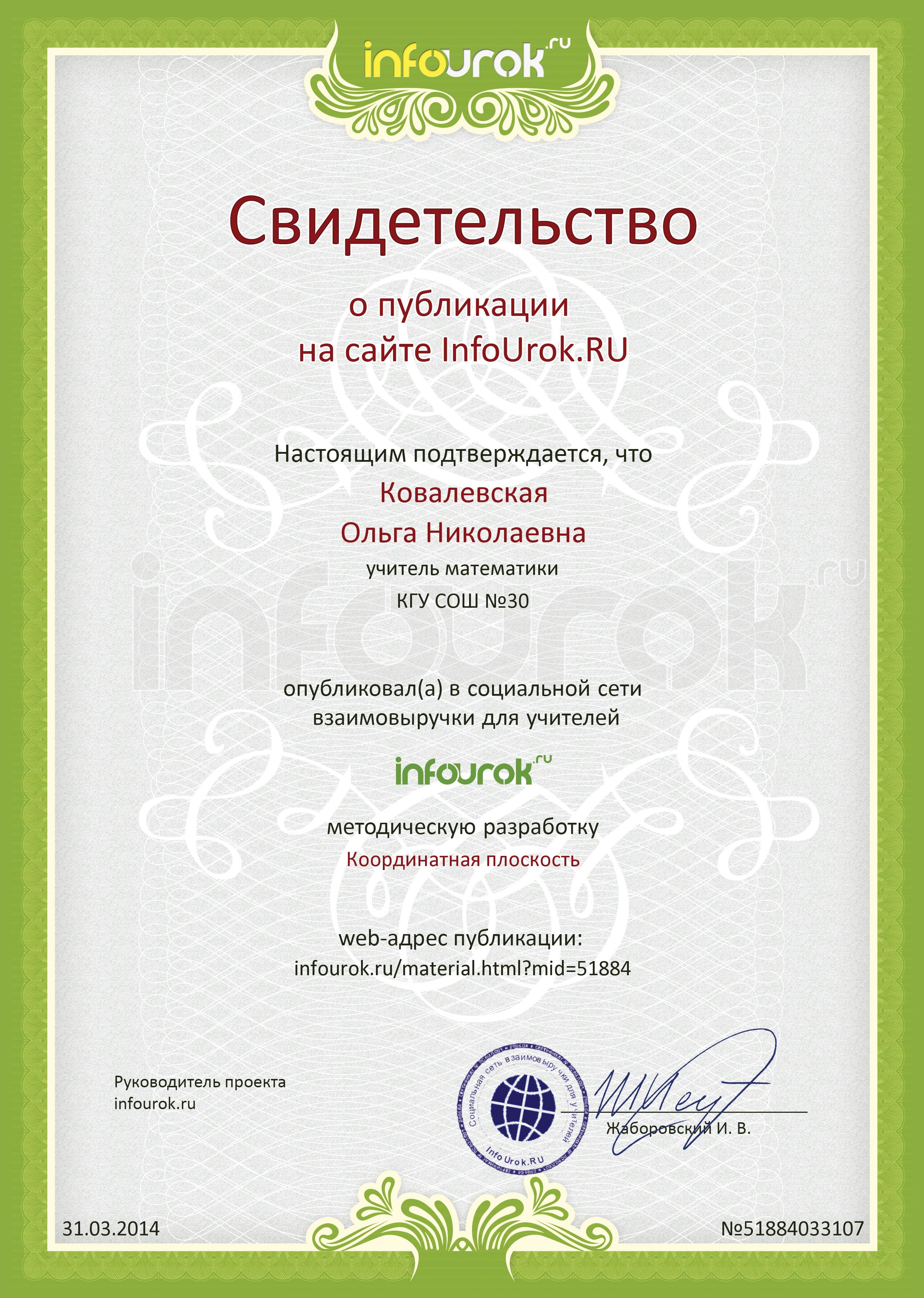 infourok сайтында басылым туралы куәлігі, Ковалевская О.Н. 6 сынып оқушыларына арналған әдістемелік зерттеме- математика: "Координаттық жазықтық" |