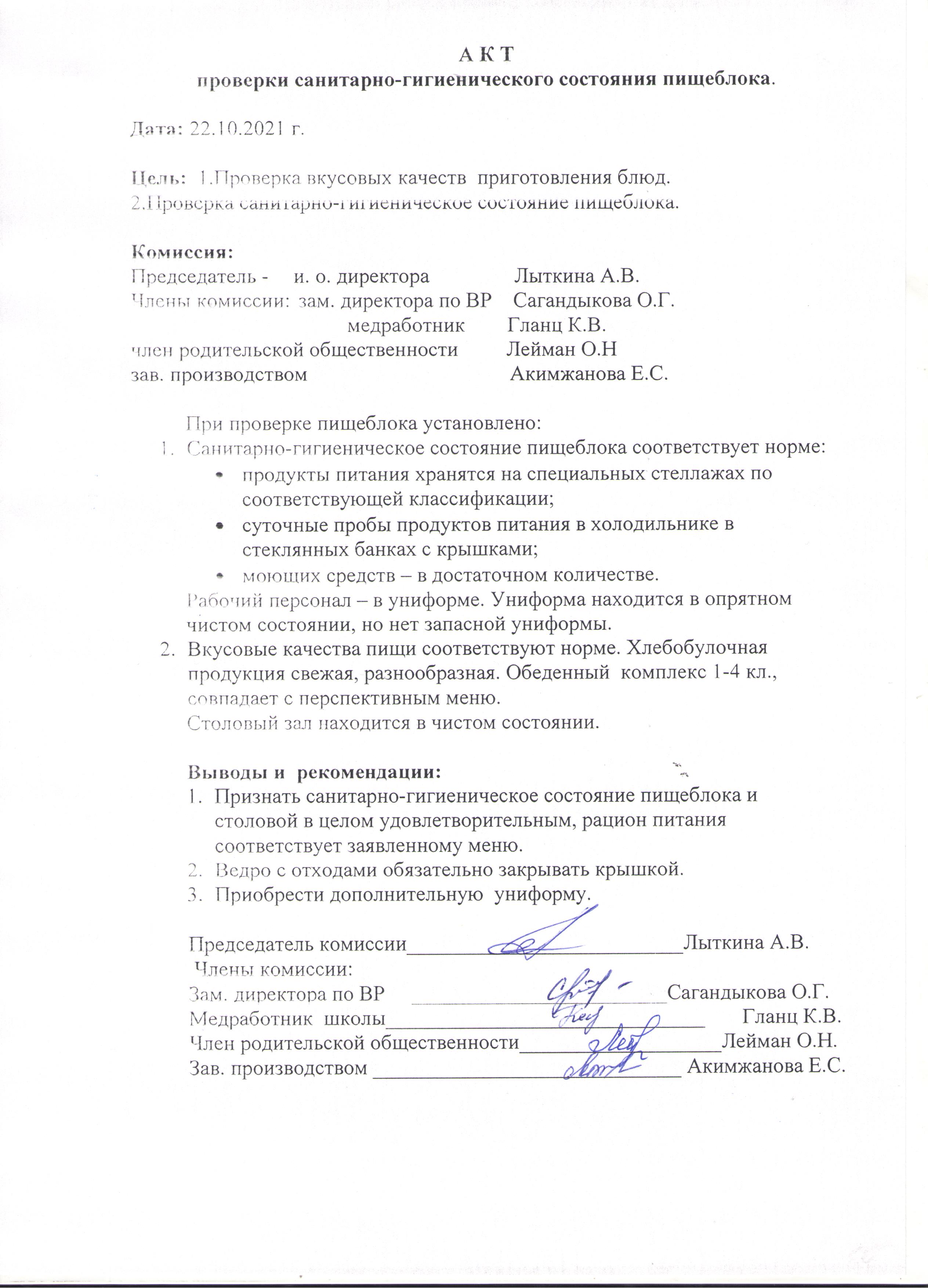 Акт проверки санитарно-гигиенического состояния пищеблока от 22.10.2021Акт проверки санитарно-гигиенического состояния пищеблока от 22.10.2021 |