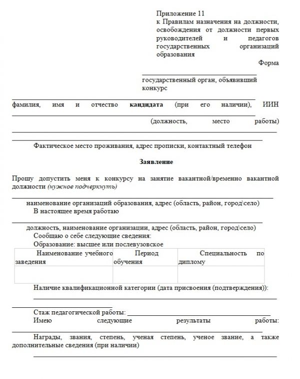 1) заявление об участии в конкурсе с указанием перечня прилагаемых документов согласно приложению 11 к настоящим Правилам;