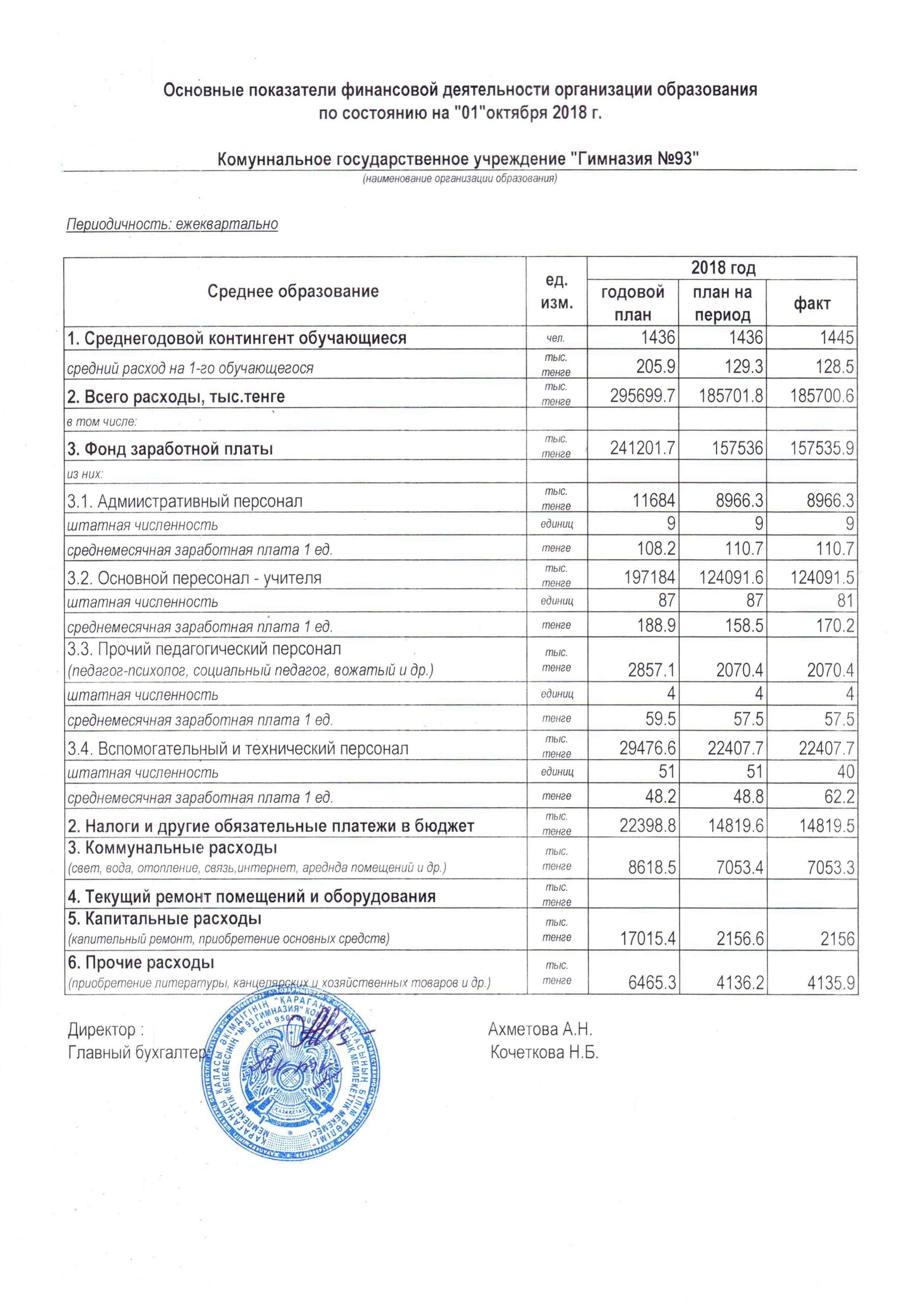 Основные показатели финансовой деятельности организации образования по состоянию на 1 октября 2018 г.Основные показатели финансовой деятельности организации образования по состоянию на 1 октября 2018 г. |