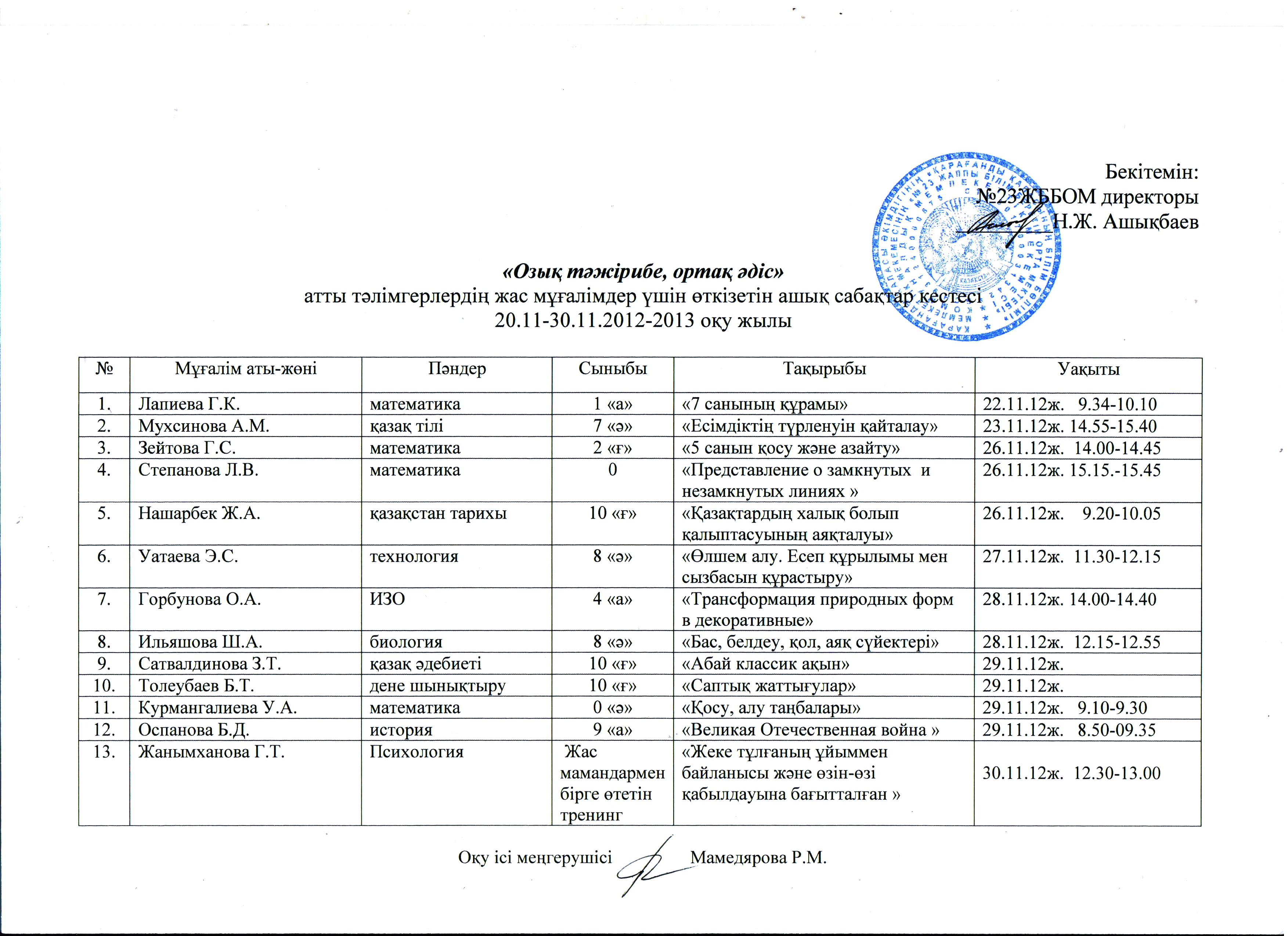 «Озық тәжірибе, ортақ әдіс» атты тәлімгерлердің жас мұғалімдер үшін өткізетін ашық сабақ 20.11-30.11.2012-2013 оқу жылы.«Озық тәжірибе, ортақ әдіс» атты тәлімгерлердің жас мұғалімдер үшін өткізетін ашық сабақ 20.11-30.11.2012-2013 оқу жылы. |