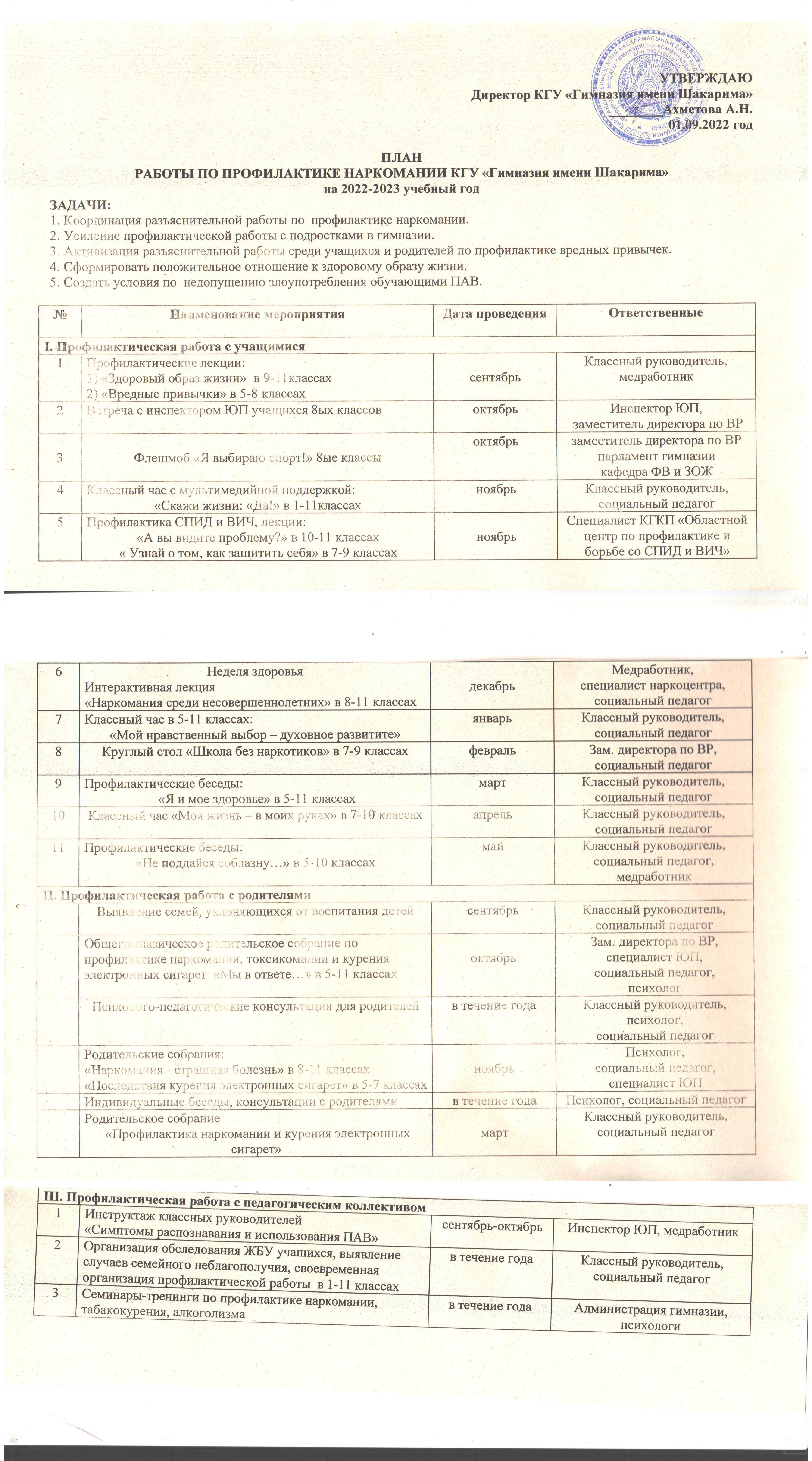 План мероприятий, направленных на профилактику алкоголизма и наркомании, токсикомании и табакокурения среди несовершеннолетних на 2022-2023 учебный годПлан мероприятий,