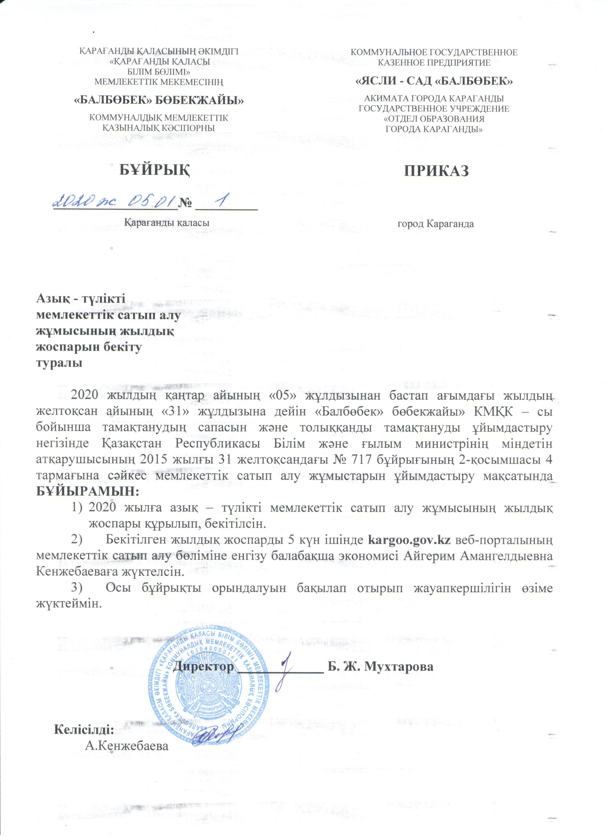 Приказ № 1 на утверждение годового плана по продуктам питания от 05.01.2020 г.Приказ № 1 на утверждение годового плана по продуктам питания от 05.01.2020 г. |