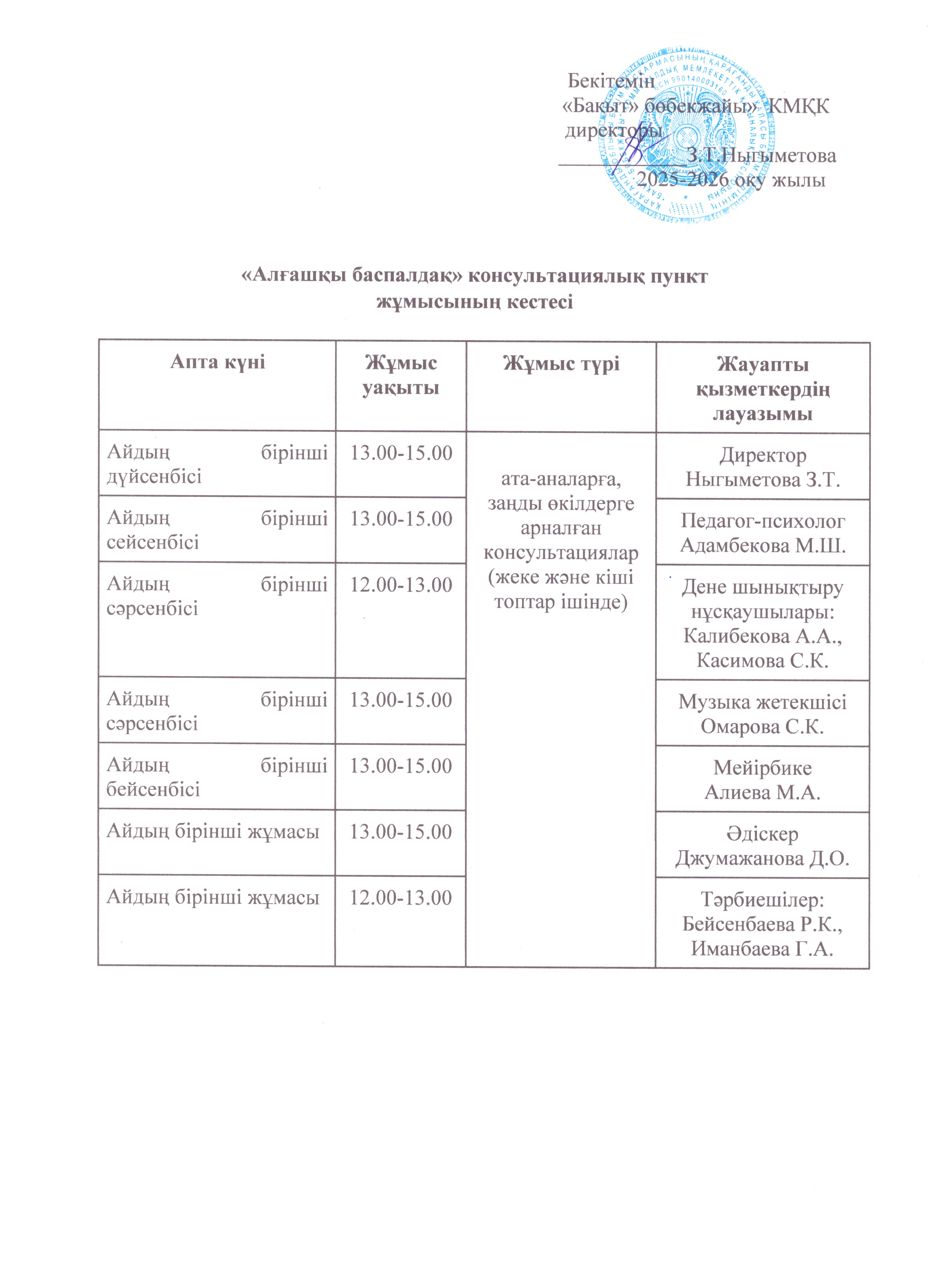 «Алғашқы баспалдақ» консультациялық пункт жұмысының кестесі«Алғашқы баспалдақ» консультациялық пункт