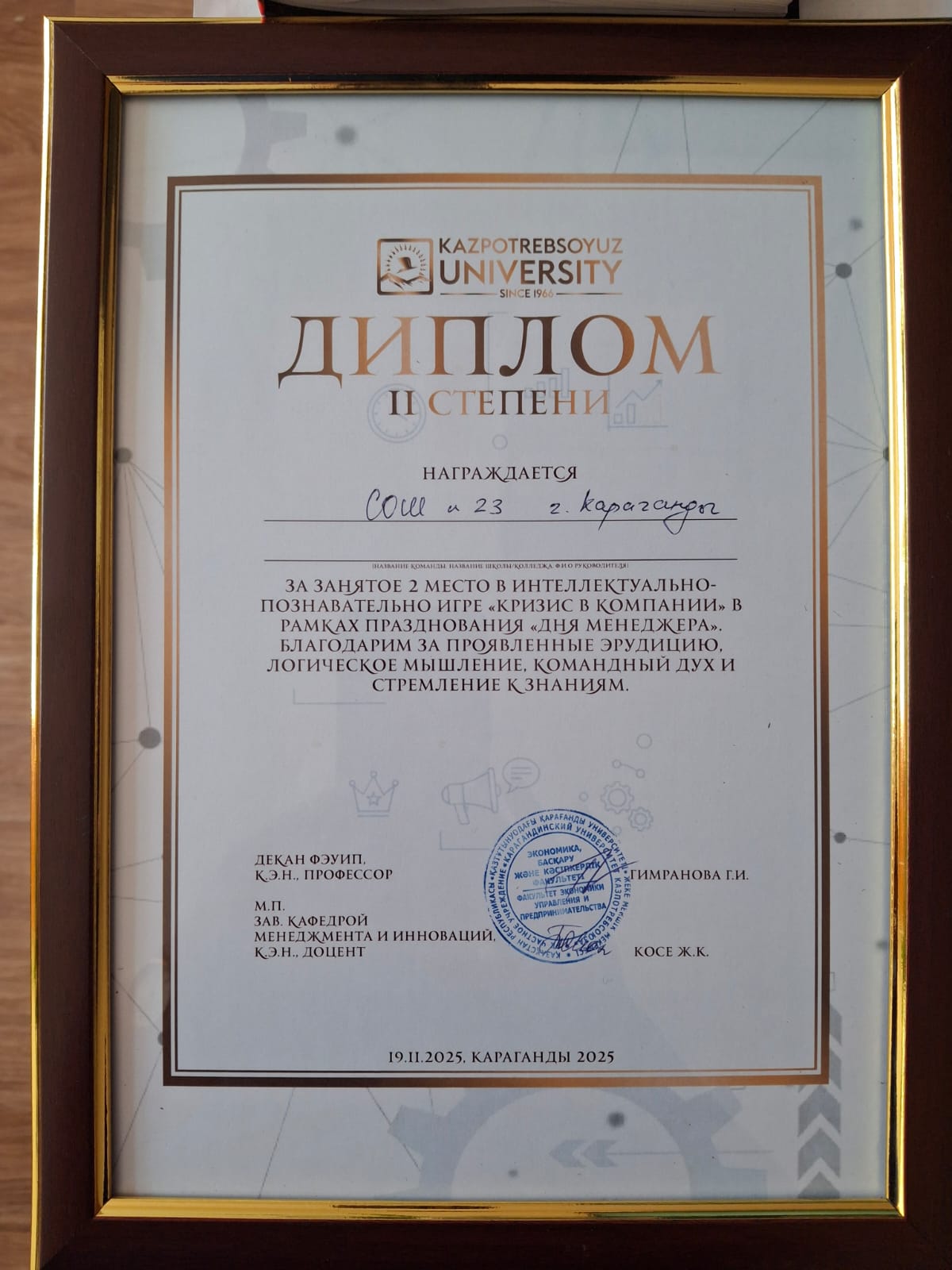 БОС ЛАУАЗЫМДАРҒА ОРНАЛАСУҒА АРНАЛҒАН КОНКУРСТЫҢ НӘТИЖЕСІ 10.11.2025-18.11.2025"VR сәулет және веб-дизайн" бағыты бойынша қосымша білім беру педагогының бос лауазымына орналасуға арналған конкурстың жеңімпазы Камалова Нұрлықыз Сейітжанқызы деп танылсын. Қатысуға өтінімдердің болмауына байланысты бос лауазымдарға орналасуға арналған конкурс: ДИРЕКТОРДЫҢ ОҚУ-ТӘРБИЕ ЖҰМЫСЫ ЖӨНІНДЕГІ ОРЫНБАСАРЫ, ЖАЛПЫ БӨЛІМ МЕҢГЕРУШІСІ, ӘДІСКЕР, ПЕДАГОГ-ДЕФЕКТОЛОГ, ҚОСЫМША БІЛІМ БЕРУ ПЕДАГОГІ бағыттары бойынша: Интеллектуалдық студия, Робототехника, Театр студиясы, Теледидар және фото студия, Hi – Tech, Ағылшын тілі, Қазақ тілі, Домбыра, Вокал, болып саналсын орындалмады. Қосымша конкурс өткізу 2025 жылғы 26 қарашаға тағайындалсын. |