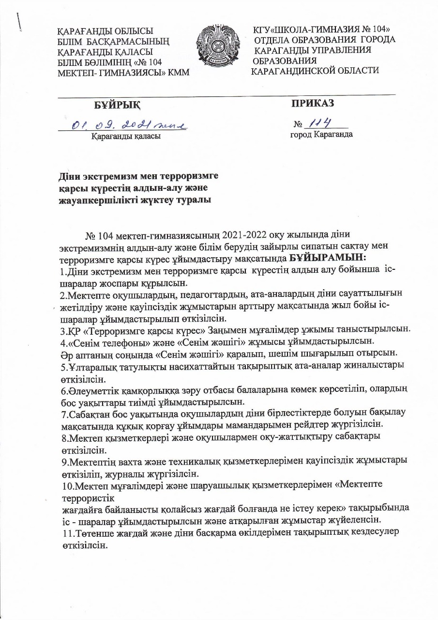О профилактике и возложении ответственности за борьбу с религиозным экстремизмом и терроризмомДіни экстремизс мен терроризмге қарсы күрестің алдын-алу және жауапкершілікті жүктеу туралы |