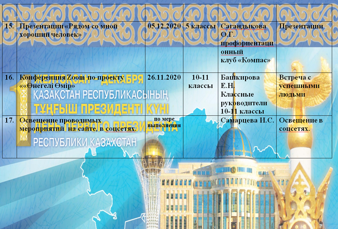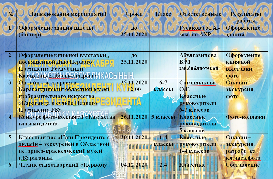 ПЛАН МЕРОПРИЯТИЙ, посвященный празднованию ДНЯ ПЕРВОГО ПРЕЗИДЕНТА и ДНЯ НЕЗАВИСИМОСТИ РЕСПУБЛИКИ КАЗАХСТАН в КГУ «СОШ№52 имени академика Е.А.Букетова»ПЛАН МЕРОПРИЯТИЙ,