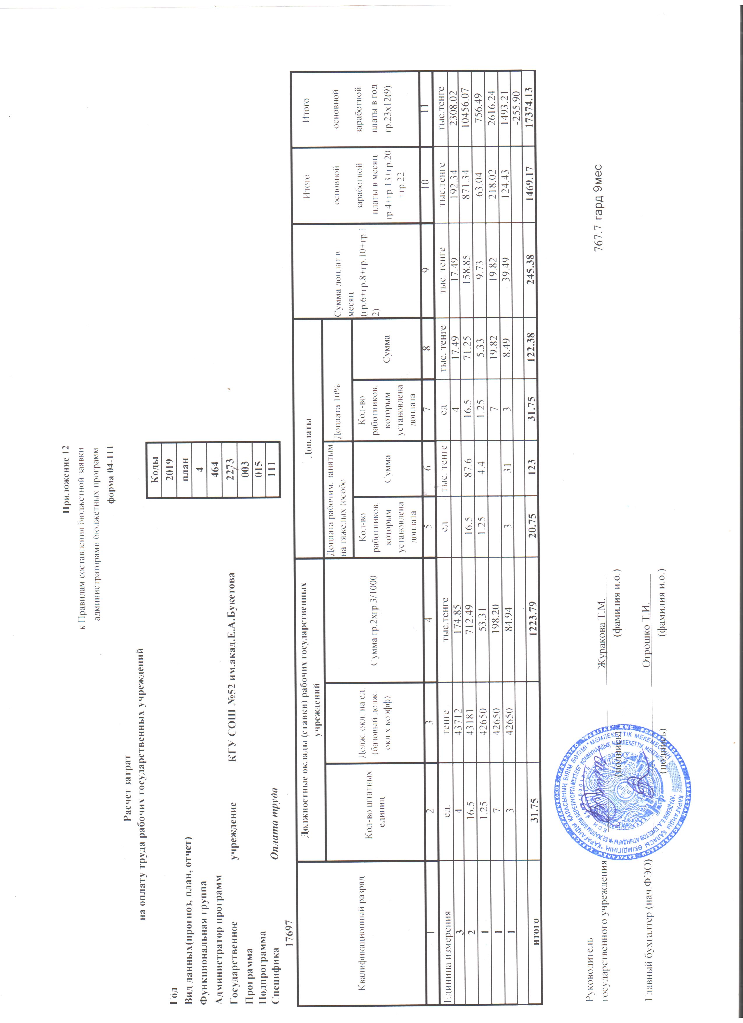 Бюджетная заявка. Расчет затрат на оплату труда рабочих гос. учреждений 2019. Приложение №12, форма 04-11118.10.2019 |