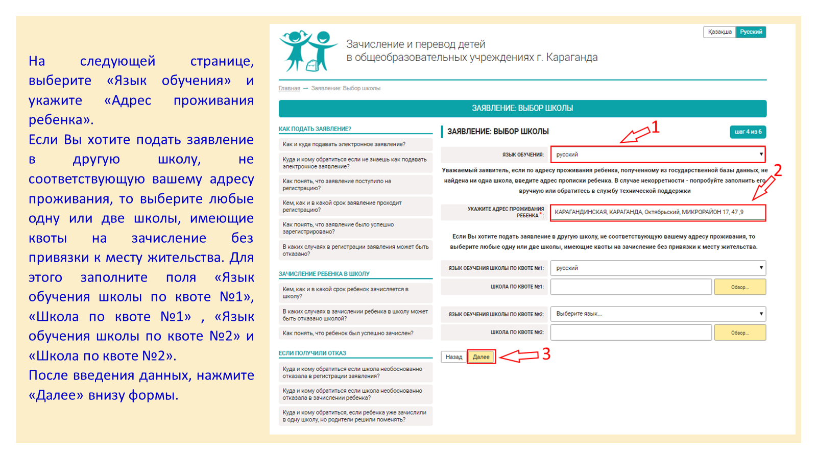 Инструкция подачи заявления через портал http://school.kargoo.gov.kz/ru/Для родителей будущих первоклассников |