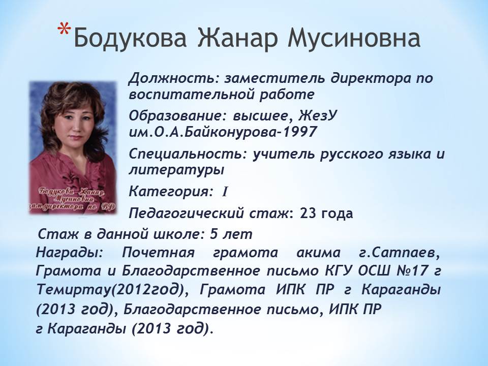 Бодукова Жанар МусиновнаБодукова Жанар Мусиновна |