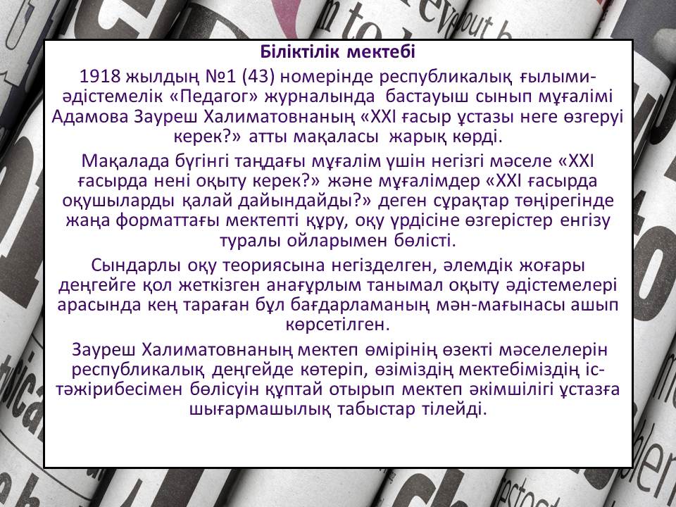 Отзыв на статью Т.Бредихиной директор ШЛ №66 г. Караганды Нурмуханов Б.Н.,Отзыв на статью Т.Бредихиной «Госаттестация: эффективный механизм контроля или пятое колесо в телеге» |