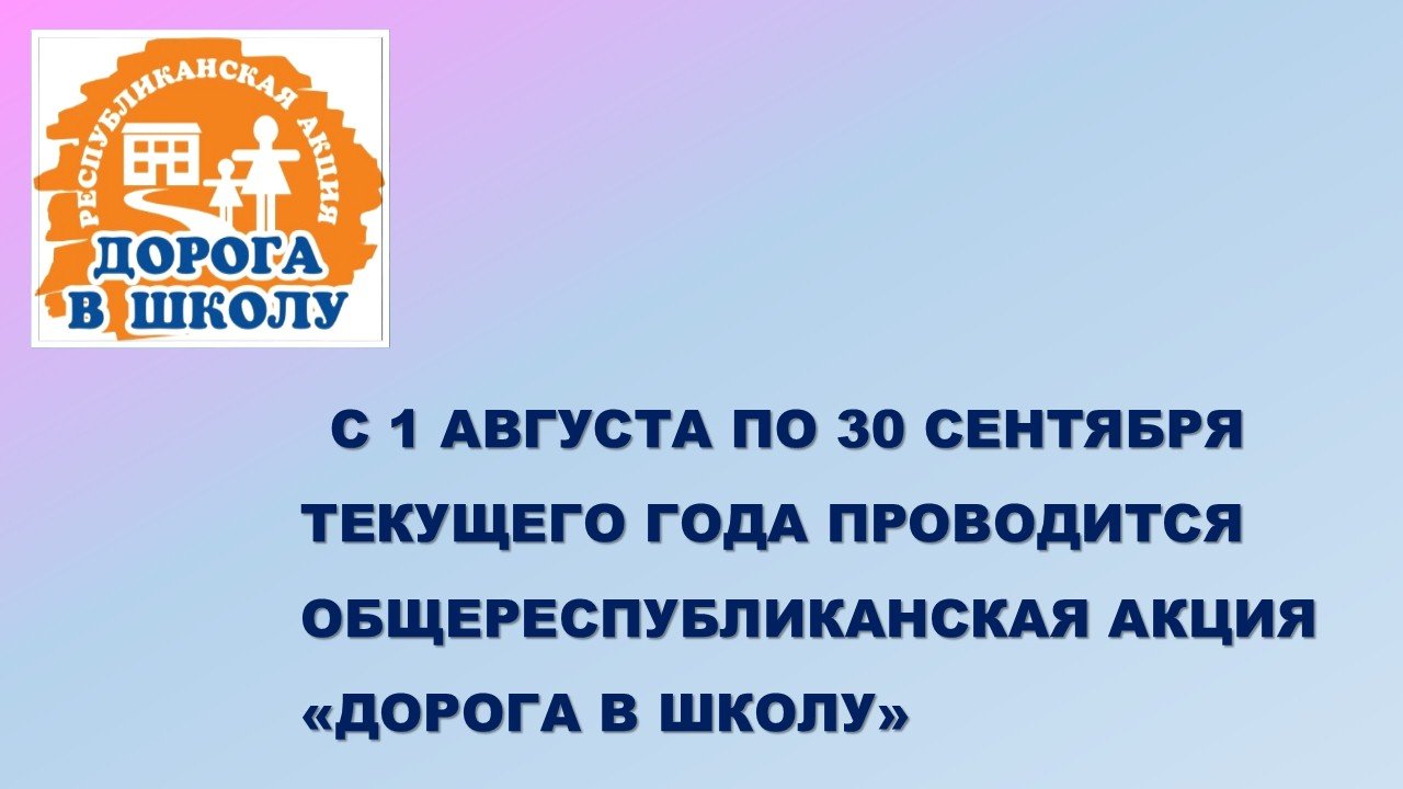 Общереспубликанская акция «Дорога в школу»Министерство образования и науки Республики Казахстан во исполнение поручения Главы государства об обеспечении полной посещаемости учащимися школ проводит акцию «Дорога в школу». Акция проходит во всех регионах нашей страны в период с 1 августа по 30 сентября. Цель акции – оказание поддержки школьникам из малообеспеченных семей.