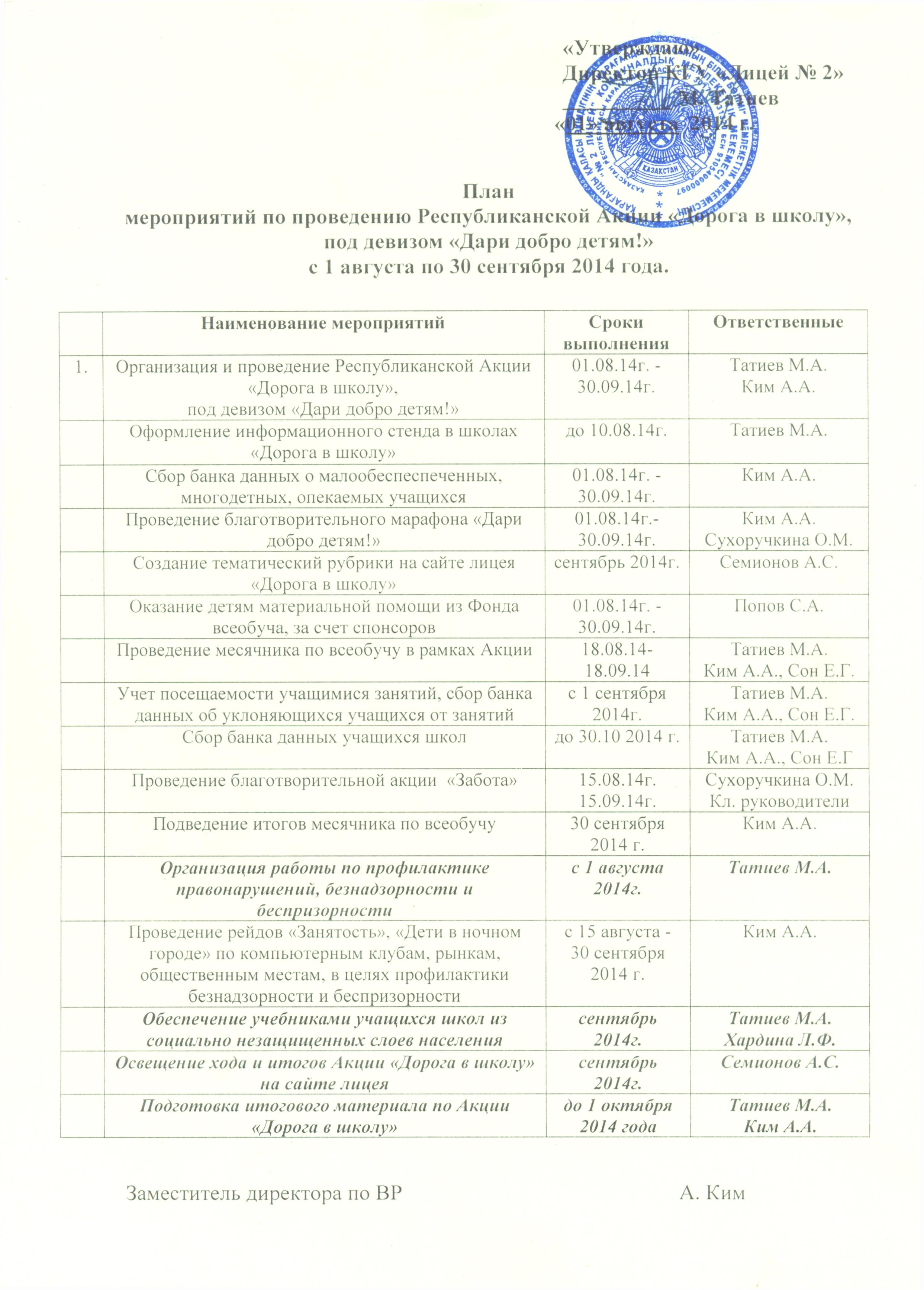 План мероприятийПлан мероприятий по проведению Республиканской акции "Дорога в школу" под девизом "Дари добро детям !" с 1 августа по 30 сентября 2014 года. |