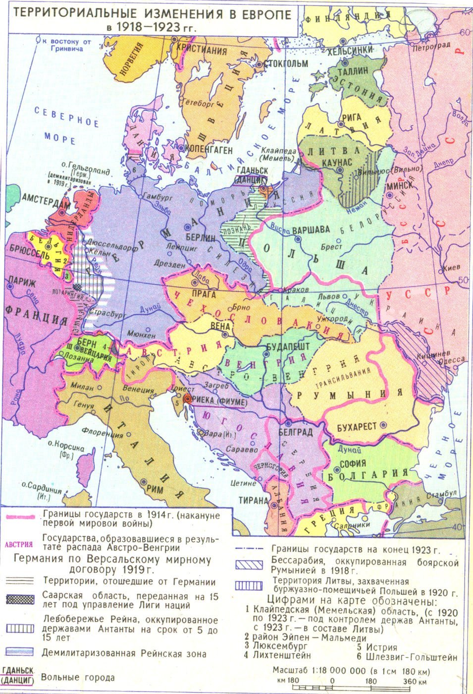 9 класс. История. Карта Европы после мировой войныИспользуя эту карту и текст "Версальский мир" необходимо ответить на вопросы в контурных картах. |