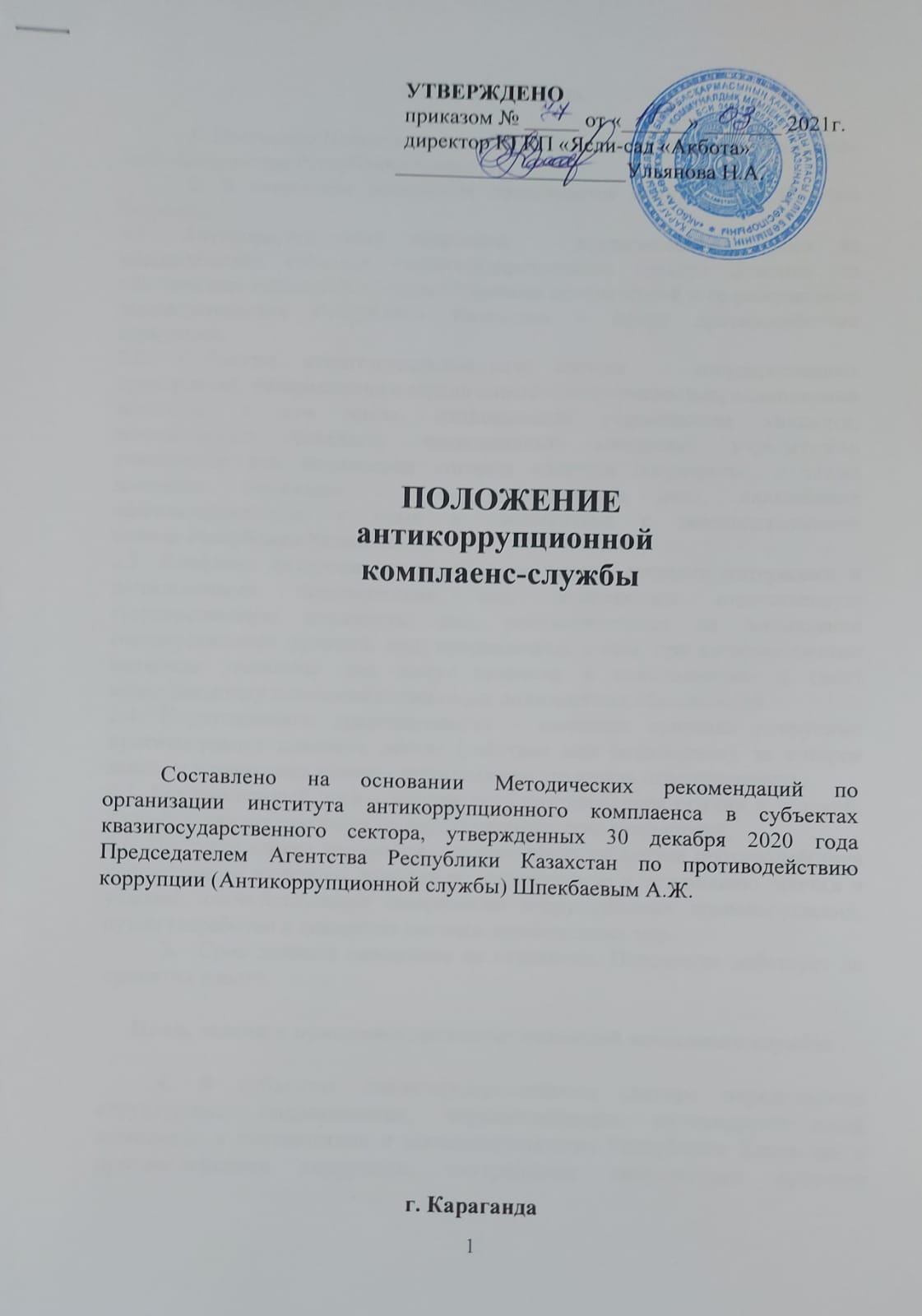 Приказназначение ответственного за антикоррупционную комплаенс-службу в КГКП "ясли сад "Алтын сақа" |